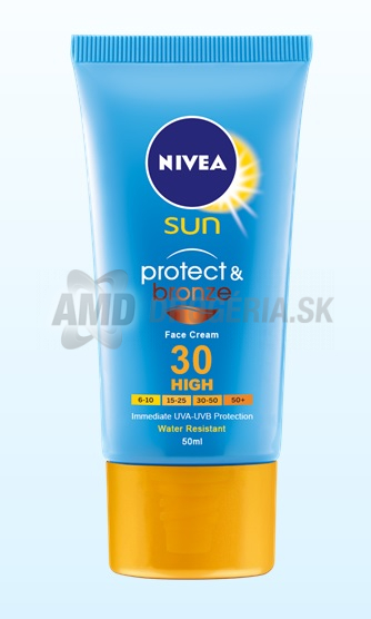 Nemáte po opaľovaní takú krásnu bronzovú až hnedú pokožku, ako by ste si priali? Prírodné rastlinné výťažky vám pomôžu pri tvorbe pleti vlastného melanínu, vďaka ktorému pokožka intenzívnejšie tmavne. Vyskúšajte extra ľahkú, nemastnú a účinnú ochranu pred spálením pleti: NIVEA Pleťový krém na opaľovanie podporujúci zhnednutie Protect & Bronze OF 30.