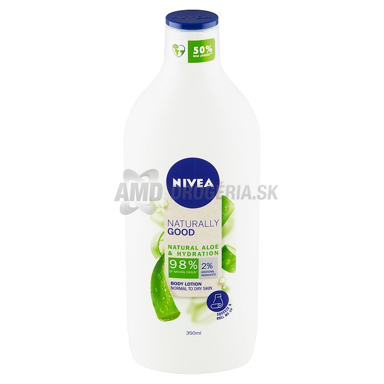 Už vás nemusí trápiť zvyškové množstvo mlieka na dne fľaše! Novinka od Nivea! Ohybný materiál prípravku umožňuje fľašu stlačiť a zrolovať! Telové mlieko Naturally Good poskytuje dokonalú hydratáciu normálnej až suchej pokožke. Výživujúce zloženie so 100 % prírodnou Aloe vera dodáva pokožke potrebnú dávku vlhkosti, regeneruje ju a uvoľňuje jej napätie. Už vám nič nebráni tešiť sa z jemnej a hebkej pokožky! Telové mlieko udržiava pokožku hladkú a vyživenú po celých 48 hodín. Potešte sa voňavým a zvláčňujúcim mliekom Nivea! Minimálne kvôli špeciálnemu obalu sa to oplatí.