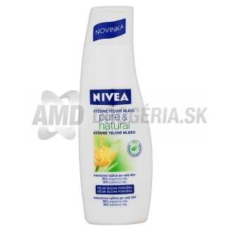 NIVEA Výživné telové mlieko Pure & Natural s obsahom prírodného oleja z arganového a jojobového oleja, získaných biologickou cestou, bolo vyvinuté pre potreby veľmi suchej pokožky.