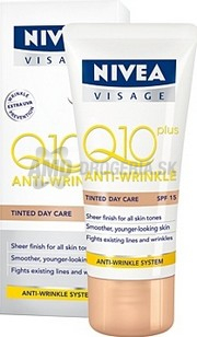 NIVEA VISAGE Q10 KRÉM TÓNOVACÍ 50 MLQ10 a kreatín sú vysoko účinné látky, ktoré sa prirodzene nachádzajú vo Vašej pleti. S pribúdajúcim vekom sa ich množstvo znižuje, čo spôsobuje úbytok energie pre ďalšiu regeneráciu pleti. NIVEA Q10 plus rad obsahuje účinné zloženie pleti vlastného koenzýmu Q10 a kreatínu, ktoré pôsobí efektívne proti vráskam a zároveň v harmónii s Vašou pleťou.NIVEA VISAGE Tónovací denný krém proti vráskam Q10 plus viditeľne redukuje vrásky a pomáha predchádzať vzniku nových.Účinky a vlastnosti: Efektívne bojuje proti vráskam zvnútra. Dokonale sa prispôsobí prirodzenému tónu Vašej pleti a dodá jej jednotný a zdravý vzhľad. Zvyšuje obsah pleti vlastného koenzýmu Q10 a kreatínu. OF 15 a UVA ochrana chráni pleť pred vznikom vrások spôsobených slnečným žiarením.Použitie:Nanášajte na vyčistenú pleť. Aplikujte malé množstvo krému na tvár, krk a dekolt a jemne vmasírujte krúživými pohybmi smerom hore. Vynechajte citlivú oblasť okolo očí.