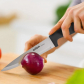 Ergonomicky tvarovaná rukoväť zo syntetického materiálu sa dobre drží a poskytuje bezpečný úchop. Zaoblená časť medzi rukoväťou a čepeľou zároveň zvyšuje ochranu prstov pri manipulácii.