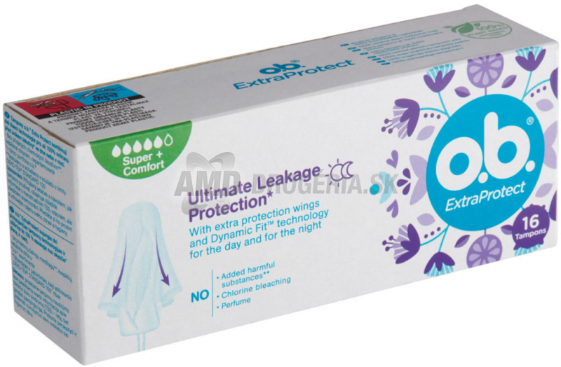 o.b.® tampóny ExtraProtect Super plus v balení obsahujúcom 16 kusov. Tieto tampóny sú navrhnuté pre veľmi silnú menštruáciu a poskytujú mimoriadnu ochranu proti pretečeniu a úniku tekutiny. S využitím SilkTouch® krídeliek a DynamicFitTM technológie prinášajú pohodlie a bezpečnosť počas celého dňa aj noci.