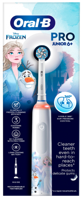 Elektrická zubná kefka Oral-B Junior s motívom Ľadového kráľovstva bola vyvinutá v spolupráci so zubnými lekármi, aby deťom pomohla dosiahnuť dôkladné a šetrné čistenie zubov. Okrúhla kefková hlava s extra mäkkými vláknami jemne čistí zuby aj ďasná, zatiaľ čo 360° vizuálny senzor tlaku sa rozsvieti na červeno a automaticky zníži rýchlosť, keď dieťa pritlačí príliš silno.