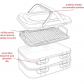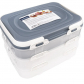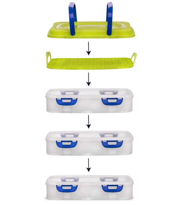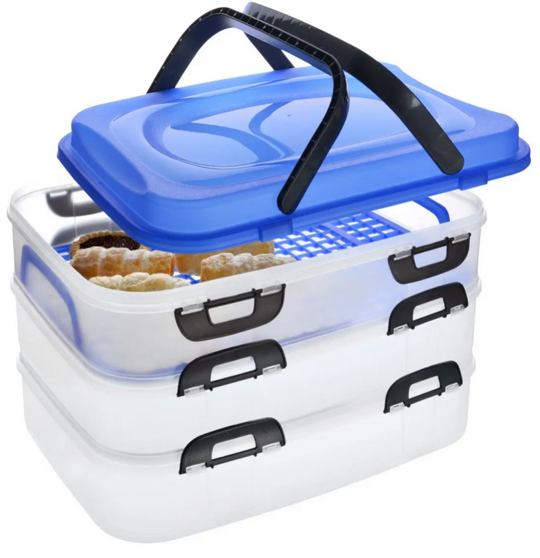 Cukrovinky napečené, chlebíčky a jednohubky pripravené – tento piknikový box z odolného PP plastu zabezpečí ich bezpečný prevoz na piknik v parku, k vode, grilovačku s priateľmi alebo rodinnú oslavu, nielen o sviatkoch. Ponúka tri samostatné poschodia, ktoré sa k sebe pevne spájajú niekoľkými klipmi, plastovú mriežku s ušami na jednoduché vyberanie obsahu a veko s dvoma držadlami pre pohodlné nosenie.