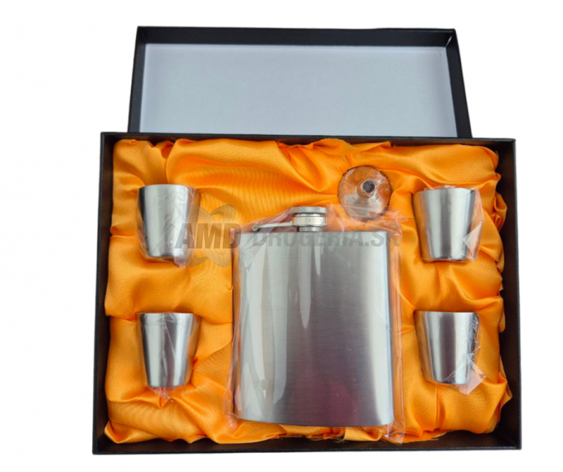 V balení nájdete elegantnú darčekovú krabičku, ktorá už sama o sebe pôsobí luxusným dojmom. Súčasťou sady je aj kvalitná nerezová ploskačka s objemom 210 ml, vybavená uzáverom proti vyliatiu. Pre komfortné pitie sú v sade 4 nerezové poháriky s objemom 30 ml, ideálne na každý nápoj. Praktický lievik vám uľahčí plnenie ploskačky a starostlivosť o detail je znateľná v každom prvku sady.