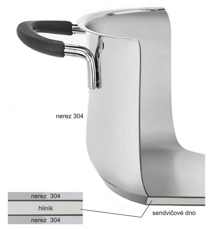- Termoakumulačné dno: Silné sendvičové dno šetrí energiu a rovnomerne rozvádza teplo, čo umožňuje vypnúť sporák pred koncom varenia a nechať pokrm "dôjsť".