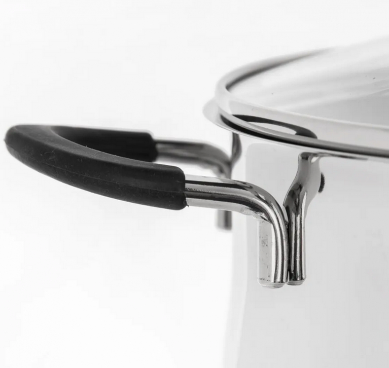 - Ergonomické úchytky: Nekĺzavé silikónové rukoväte znižujú teplotu pri manipulácii a zabraňujú popáleniu. Rukoväte sú plné, čo zabraňuje zadržiavaniu vody pri umývaní v umývačke.