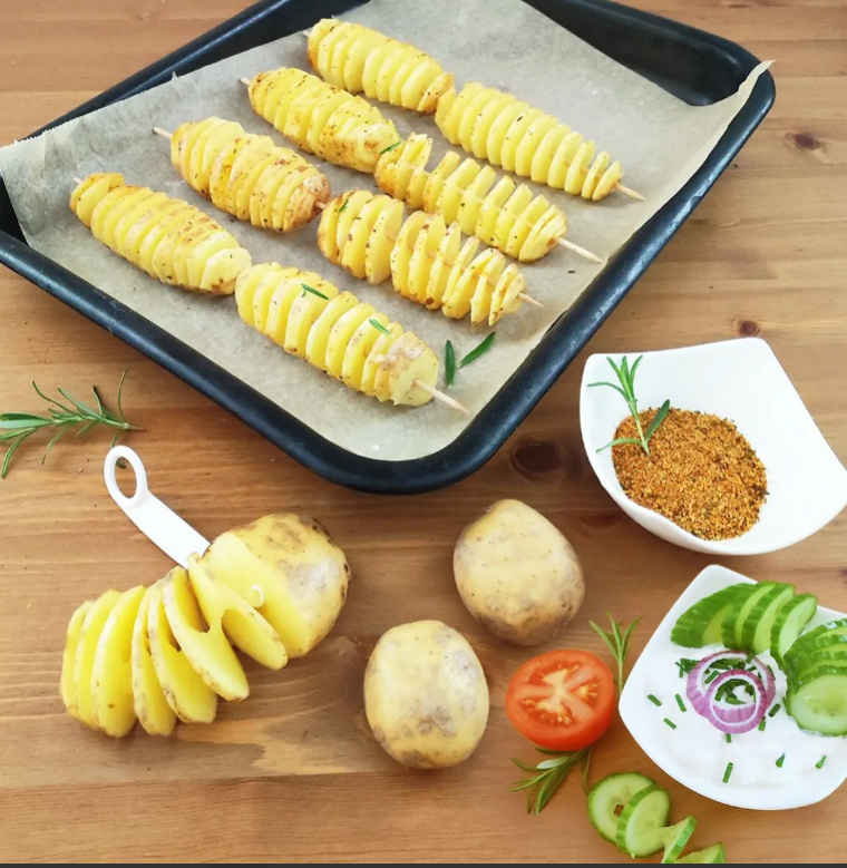 Použitie krájača je jednoduché: stačí odrezať špičku zeleniny, natočiť hrot so závitom do stredu a otáčať rukoväťou. Zemiaky môžete napichnúť na špajľu a usmažiť, alebo piecť v rúre. Špirálky z čerstvej zeleniny sú tiež skvelým spôsobom, ako ozdobiť šaláty či chlebíčky.