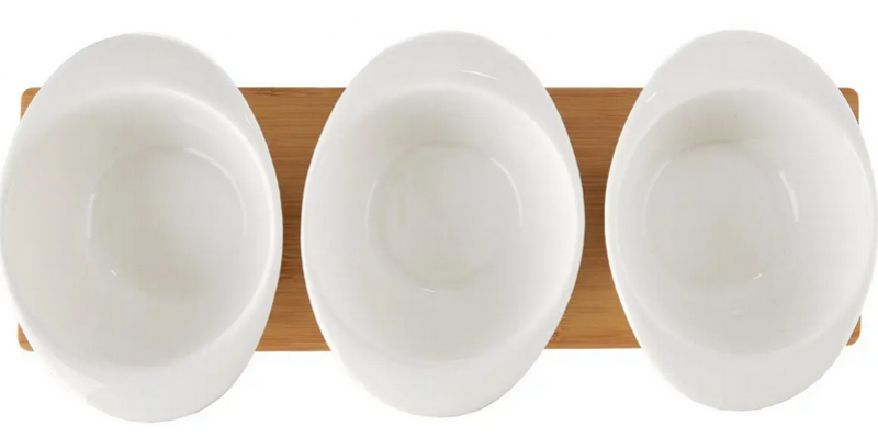 Elegantný servírovací set WHITELINE pozostáva z troch oválnych porcelánových misiek, umiestnených na štýlovej bambusovej tácke, a je ideálny na podávanie rôznych drobných pochutín. Či už pripravujete olivy, syry, orechy, údeniny, zeleninu alebo dipy, tento set vám uľahčí servírovanie pre hostí na rautoch, grilovačkách či rodinných oslavách. Využiť ho môžete aj pri raňajkách vo forme bufetu na marmelády, med, sirupy, jogurt alebo semienka.