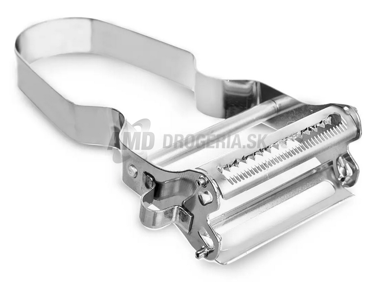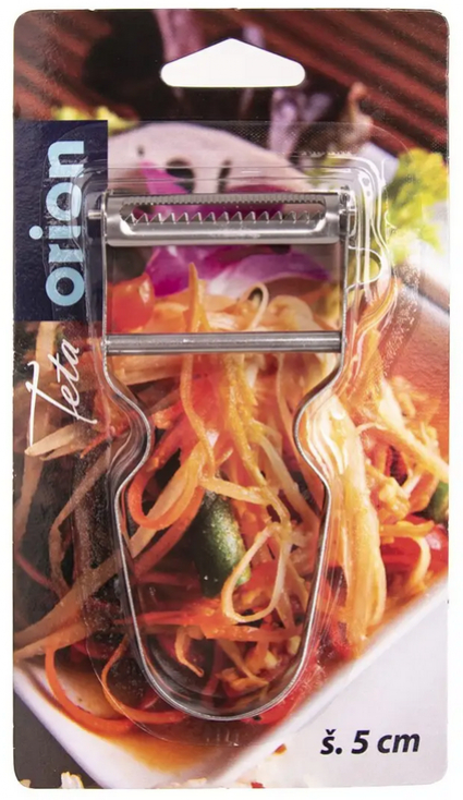 - Dvojité ostrie: Jedno hladké ostrie na škrabanie a krájanie tenkých plátkov zeleniny a ovocia, druhé ostrie je určené na krájanie rezancov zo zeleniny alebo syra.