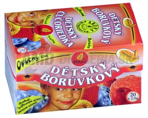 OVOCNÝ ČAJ DETSKÝ ČUČORIEDKOVÝ Detský ovocný čaj pre bežné pitie. Chuťovo vyvážená zmes s príchuťou čučoriedky. Obsahuje min.5% čučoriedkového plodu a prírodne identická aróma čučoriedky. Zloženie: ibištek kvet, lyofilizovaná čučoriedka plod 10%, šípka plod, jablko plod, ríbezle čierny plod, aníz plod, prírodne identická aróma, čučoriedková šťava, rooibos, sladké drievko koreň. Príprava: 1 sáčok preliať 0,3 l vriacej vody. Lúhovať 10 min. Obsahuje mrazom sušené ovocie