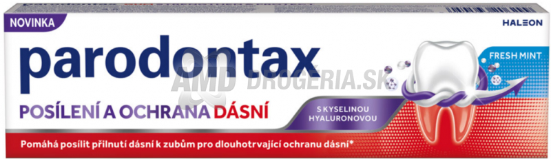 Zubná pasta Parodontax Fresh Mint je špeciálne vyvinutá pre starostlivosť o ďasná a zuby. Pri pravidelnom používaní dvakrát denne pomáha posilňovať spojenie ďasien so zubami a zabezpečuje dlhodobú ochranu ďasien. Táto pasta obsahuje kyselinu hyalurónovú, ktorá je dôležitá pre udržiavanie zdravých a silných ďasien, a taktiež fluorid, ktorý znižuje riziko vzniku zubného kazu. Vďaka sviežej mentolovej príchuti zanecháva príjemný pocit sviežosti v ústach a pomáha udržiavať zdravé ďasná každý deň.