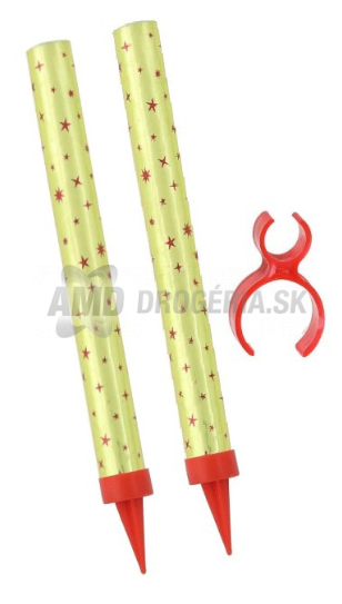 Balenie obsahuje 2 kusy vnútornej zlatej fontány s dĺžkou 15 cm, vybavené plastovým podstavcom na bezpečné zapichnutie do torty. Súčasťou sú aj originálne držiaky na fľašu, ktoré umožňujú jednoduché upevnenie fontány na hrdlo fľaše – ideálne na párty, narodeniny či oslavy.