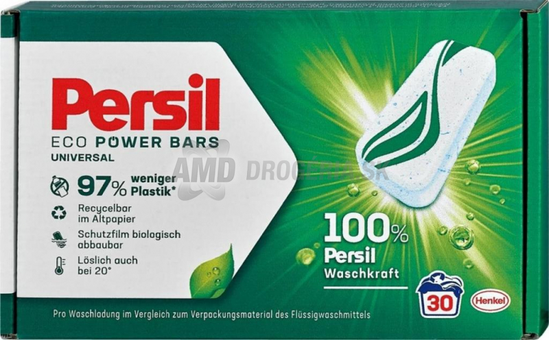 PERSIL Eco Power Bars Universal pracie tablety 30ks Univerzálne pracie tablety sú určené na pranie bielej i farebnej bielizne. Pracie tablety sa rýchlo rozpúšťajú a prenikajú hlboko do vlákien, kde účinne odstraňujú všetky škvrny a nečistoty. Pracie tablety sú účinne už od 20°C. Poskytuje dokonalú čistotu a dlhotrvajúcu sviežosť. Zanecháva vaše oblečenie dokonale čisté a svieže s príjemnou vôňou. Balenie obsahuje: 30ks