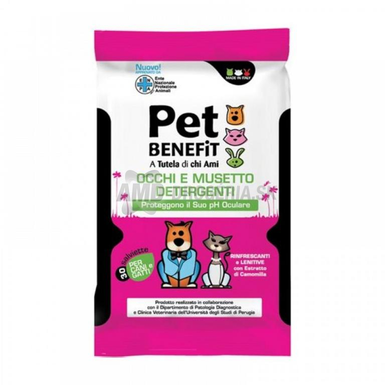 Čistiace vreckovky Pet Benefit sú ideálnym pomocníkom na starostlivosť o oči a ňufáčik vášho miláčika. Ich pH zodpovedá pH očí psíka alebo mačičky aby sa zabránilo podráždeniu a začervenaniu počas použitia. Sú bez alkoholu, obohatené extraktom z harmančeka, ktorý má upokojujúci účinok. Praktické balenie vám umožní mať vreckovky hneď pripravené k použitiu.