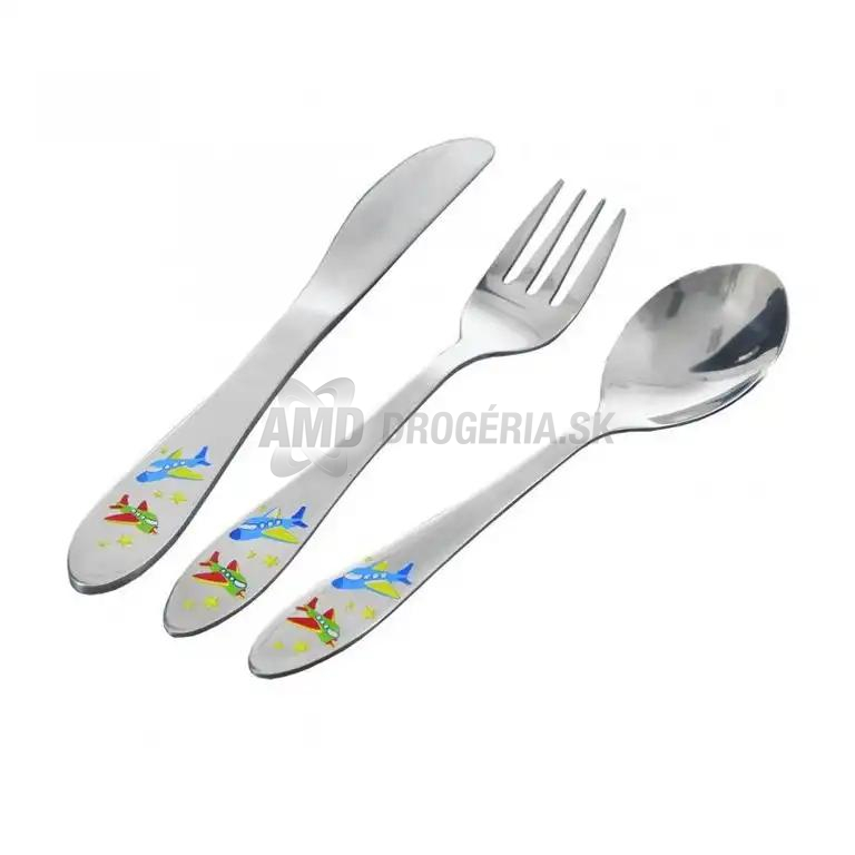 nerezový, detský, s farebným dekórom lietadiel, obsahuje 3 ks - lyžicu, vidličku a nôž, tvar prispôsobený deťom, rozmery: (dĺžka/šírka) lyžica 15,5/3,5 cm, vidlička 15,5/2,5 cm, nôž 17/2 cm.