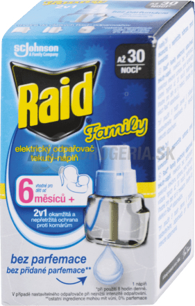 Elektrický odparovač s tekutou náplňou od značky Raid Family poskytuje efektívnu ochranu pred komármi až po dobu 30 nocí. Insekticíd bez parfumácie 2 v 1 pre okamžitú a nepretržitú ochranu pred komármi až 30 nocí pri použití 8 hodín denne. Elektrický odparovač Raid Family s jemným osvetlením je vhodný pre deti od 6 mesiacov.