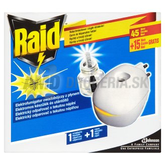 Raid elektrický odparovač s tekutou náplňou, insekticídny prípravok pre domáce použitie. Poskytuje veľmi účinnú ochranu, pôsobí rýchlo a trvalo proti komárom a ostatnému drobnému lietajúcemu hmyzu. Účinne odpudzuje lietajúci hmyz a to i pri otvorených oknách a rozsvietených svetlách až po dobu 60 nocí, pri použití 8 hodín / noc. Ochráni miestnosť do 20 m3. Pre optimálny účinok aktivujte odparovač s 30 minútovým predstihom.Rýchly a trvalý účinok!Používajte podľa návodu. Veľmi jedovatý pre vodné organizmy, môže spôsobiť dlhodobé nepriaznivé účinky vo vodnej zložke životného prostredia. Uchovávajte mimo dosahu detí. Nevylievajte do kanalizácie. Uchovávajte oddelene od potravín, nápojov a krmív na chladnom, suchom a dobre vetranom mieste.N Nebezpečný pre životné prostredie.Účinná látka: 1,2 g praletrínu v 100g prípravku.Prázdny obal a nefunkčný odparovač zneškodňujte v rámci triedeného odpadu v súlade so zákonom o odpadoch. Ďalšie upozornenia a návod na použitie je vnútri obalu.1 odparovač 1 náplň.45 nocí 15 nocí gratis.