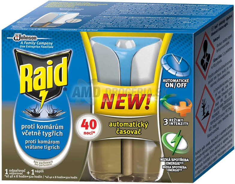 Bojujete s obtiažnym bzučaním a štípance od komárov? Každý určite zažil, keď Vás v noci otravujú komáre a nenechajú Vás spať. A práve preto, ak sa chcete zbaviť týchto starostí raz pre vždy, vyskúšajte Raid elektrický odparovač s tekutou náplňou Advanced. Zvoľte ochranu 8,12 či 24 hodín a zapojte ho. Stane sa tak automaticky každý deň v rovnaký čas.