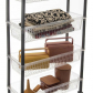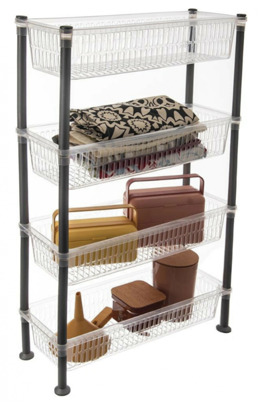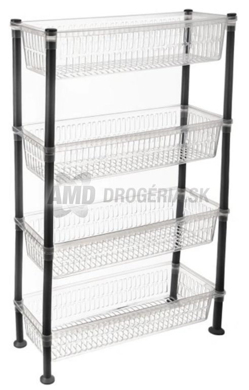 Regál je vybavený 4 transparentnými dierovanými policami, ktoré sú vhodné na uloženie koreničiek, dochucovadiel, dóz so surovinami, ale aj čistiacich prostriedkov, toaletného papiera, uterákov či utierok. Je vyrobený z PP plastu, ľahko sa skladá a jednoducho sa udržiava – stačí ho utrieť vlhkou handričkou.