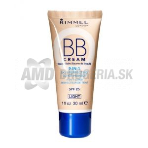 Rimmel London Rimmel London BB Cream 9in1 SPF25 Ošetrujúci balzam BB Cream, spájajúcej sily make-upu a krému.9 účinkov v jednom balení. Veľmi ľahké a svieže složení.Vyživuje, hydratuje, minimalizuje viditeľné póry, chráni, kryje, zjednocuje, zjemňuje, zmatňuje, rozjasňuje. Použitie: Aplikujte ráno na čistú pleť. Poznámka: Vyobrazený odtieň môže byť skôr orientačné, záleží na nastavení farieb Vášho monitoru