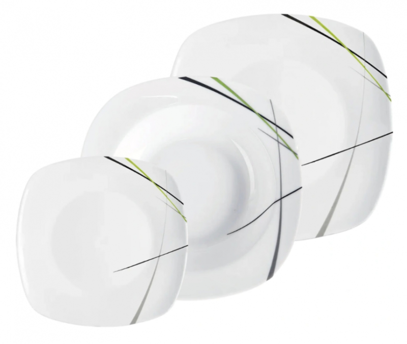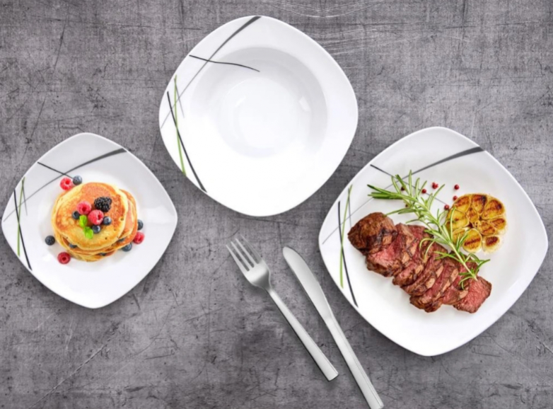 Čisté línie a hranatý tvar tanierov pôsobia moderne a elegantne, vďaka čomu súprava skvele zapadne do moderných aj tradičných interiérov. Kvalitný porcelán je odolný, príjemný na používanie a vhodný na umývanie v umývačke riadu, čo oceníte pri každodennom servírovaní.