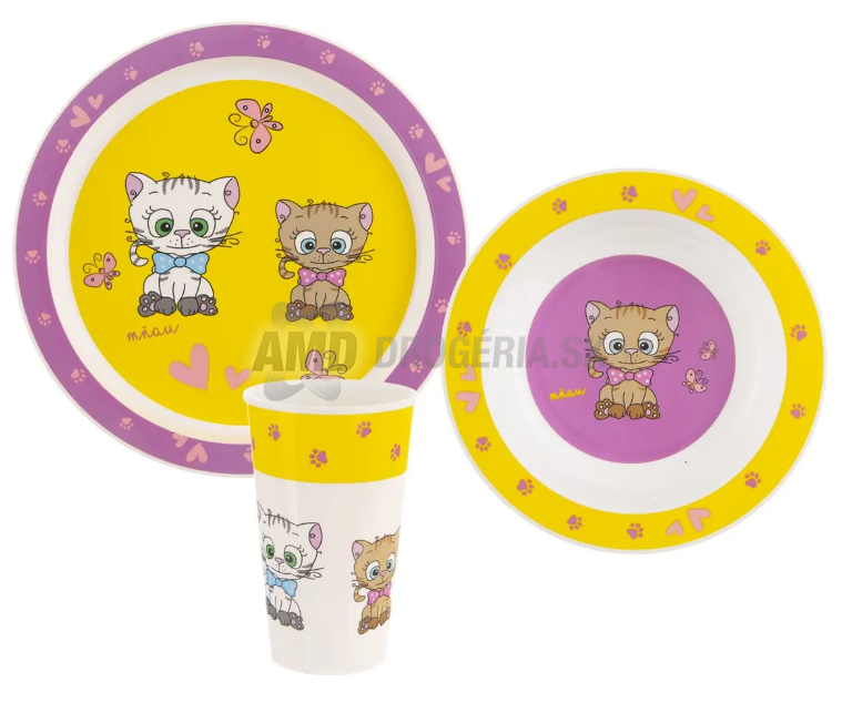 Sada jedálenských potrieb pre deti s motívom KOCÚRY je zložená z pohára, hlbokého taniera a plytkého tanierika, ktoré sú navrhnuté s ohľadom na pohodlie a bezpečnosť malých používateľov. Táto sada je ideálna pre malé deti od 3 rokov.