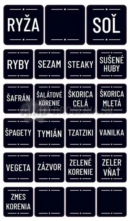 Fóliové nálepky na koreničkové dózy na označenie jednotlivých druhov korenín.