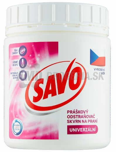Savo odstraňovač škvŕn prášok UNI využíva kombináciu pracích účinných látok s aktívnym kyslíkom. Tento prípravok je navrhnutý tak, aby účinne odstraňoval škvrny od rôznych potravín, oleja, make-upu a ďalších nečistôt, ktoré sa môžu vyskytovať na oblečení a iných textíliách. Jeho formulácia s aktívnym kyslíkom pomáha pri praní uvoľňovať a odstraňovať tieto škvrny, čím prispieva k čistote a údržbe textílií. S hmotnosťou 450 g je vhodným pomocníkom pri praní a odstraňovaní nečistôt z rôznych typov odevov a tkanín.