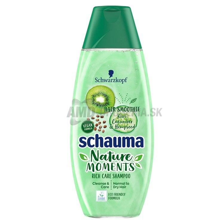 Nature Moments Hair Smoothie kiwi, uhorka a konopné semienka obohacujúci šampón. S výťažkami 100% prírodného pôvodu. Čistí a stará sa o normálne až suché vlasy. Schwarzkopf Schauma Nature Moments čistiaci a obohacujúci šampón s kiwi, uhorkou a konopnými semienkami MÁTE NORMÁLNE AŽ MIERNE SUCHÉ VLASY? Použite čistiaci a obohacujúci šampón Schauma Hair Smoothie. MÁTE NORMÁLNE AŽ MIERNE SUCHÉ VLASY? Schauma Hair Smoothie čistiaci a obohacujúci šampón s kiwi, uhorkou a konopnými semienkami ponúka: - ZLOŽKY 100% PRÍRODNÉHO PÔVODU - ČISTIACU A OBOHACUJÚCU STAROSTLIVOSŤ: Inšpirované misami plných zdravých dobrôt, ktoré sú výborné a zdravé, tak aj naše Hair Smoothie šampóny a kondicionéry vlasy vyživujú a urobia ich krajšími a silnejšími. - VEGÁNSKE A EKOLOGICKÉ ZLOŽENIE: Naše vegánske zloženie neobsahuje silikóny. Obaly sú vyrobené z 30% recyklovaného plastu a pre rýchle oplachovanie pomáha šetriť vodu. ČISTIACA A OBOHACUJÚCA STAROSTLIVOSŤ: Zaisťuje, aby vaše vlasy boli krajšie a silnejšie. KIWI, UHORKA, KONOPNÉ SEMIENKA: misy plné smoothie, ktoré sú chutné a prospešné pre vaše zdravie EKOLOGICKÉ ZLOŽENIE s technológiou rýchleho oplachovania pre šetrenie vody je balené v udržateľných fľašiach vyrobených z 30% recyklovaného plastu. CERTIFIKOVANÉ EKOZNAČKOU EU, čo znamená, že všetky Nature Moments produkty spĺňajú kritériá ekologického životného cyklu. Začneme so získavaním udržateľných surovín na recykláciu a schopnosťou rozkladu pomocou mikroorganizmov. VEGÁNSKE ZLOŽENIE: Naše vegánske zloženie je bez silikónov a kožná znášanlivosť je dermatologicky overená. VERÍME V PRÍRODNÉ INGREDIENCIE PRE PRIRODZENE KRÁSNE VLASY: Naše zloženia obsahujú ingrediencie 100% prírodného pôvodu. PRIVÍTAJME! - Zložky 100% prírodného pôvodu - Rýchlo oplachová technológia šetrí vodu - Vegánske zloženie - Certifikácia značkou EU ROZLÚČME SA! - Silikóny