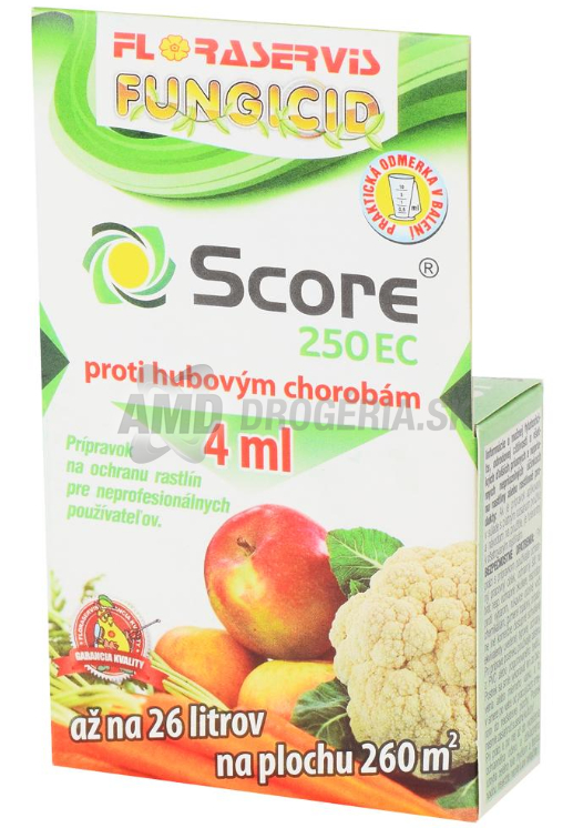 Score 250 EC 4 ml je fungicídny prípravok vo forme emulzného koncentrátu, ktorý je určený na ochranu rôznych plodov, vrátane repky ozimnej, repy cukrovej, repy kŕmnej, jadrového ovocia, mrkvy a karfiolu, proti rôznym hubovým chorobám. Jeho účinná látka je Difenoconazole v koncentrácii 250 g/l.