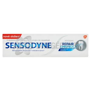 SENSODYNE Whitening Repair & Protect zubná pasta pre citlivé zuby 75ml Zubná pasta SENSODYNE Repair & Protect s bieliacim účinkom a fluoridom chráni citlivé zuby pred zubným kazom a zároveň poskytuje svieži dych. Obsahuje technológiu NovaMin, ktorá prináša úľavu od bolestivej citlivosti zubov. Zubná pasta vytvára na poškodených zuboch tvrdšiu vrstvu, čím napomáha lepšiemu zaceleniu zubnej skloviny. Zubná pasta bojuje proti prvým známkam zubného kazu a chráni ich aj medzi jednotlivými čisteniami. Každodenným používaním zubnej pasty pocítite úľavu od bolesti citlivých zubov, ochráni proti zubnému kazu a osvieži dych. Objem balenia: 75ml