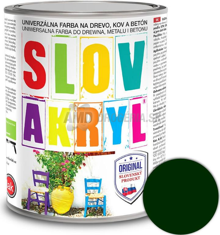 Slovakryl tmavozelený je univerzálna vodou riediteľná farba na vonkajšie a vnútorné nátery na drevo, kov a betón.