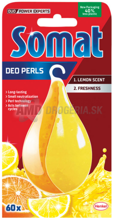 Somat osviežovač do umývačky riadu Deo Duo-Perls prináša dlhotrvajúcu vôňu citróna a pomaranča, ktorá sa uvoľňuje pri každom otvorení umývačky až po dobu 60 umývacích cyklov. Jeho účinné zložky neutralizujú nepríjemný zápach z umývačky, čo zabezpečuje svieže vnútro umývačky riadu. Stačí aplikovať Somat osviežovač na horný kôš pre sviežu citrusovú vôňu po každom umývacom cykle.