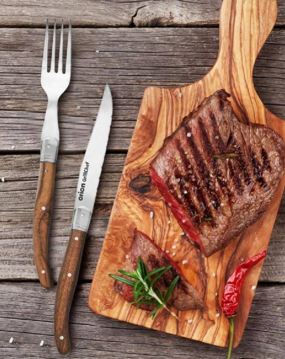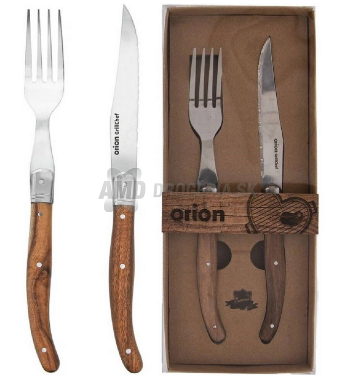 Praktická steaková sada ORION obsahuje nôž so zubatým ostrím a vidličku, ktoré si hravo poradia s každým druhom mäsa. Ideálna voľba pre milovníkov grilovania aj chutných domácich jedál.