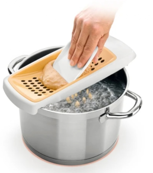 - 3 sitá a pretláčacia lopatka: Strúhadlo je vybavené tromi rôznymi sitami, ktoré vám umožňujú vytvoriť cestovinové noky, halušky a závarky s rôznymi textúrami. Pretláčanie lopatky vám pomôže jednoducho vytlačiť tvarované kúsky do ďalšej vody.