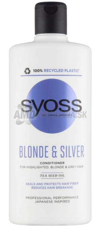 SYOSS Blonde & Silver kondicionér je špeciálne navrhnutý pre starostlivosť o blond, melírované a šedivé vlasy. Vďaka unikátnej technológii efektívne neutralizuje nežiaduce žltkasté tóny a chráni farbu pred vyblednutím. Kondicionér s obsahom semien z kvetov čaju Camellia oleifera regeneruje vlasovú štruktúru, zanecháva vlasy hebké a uľahčuje ich rozčesávanie. Vhodný na každodenné použitie, poskytuje výživu a ochranu s 90 % ingrediencií prírodného pôvodu. Produkt je vegánsky a balený v recyklovateľnej fľaši z 25 % recyklovaného plastu.
