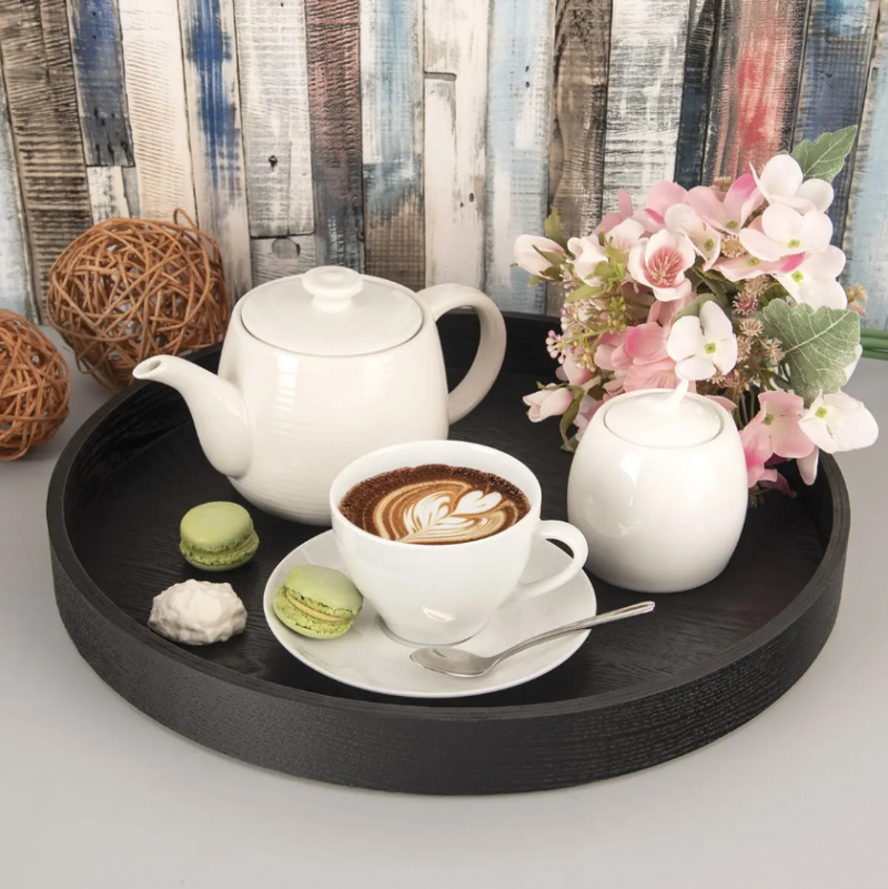Okrúhla servírovacia tácka s priemerom 38 cm, vyrobená z prírodného dreva a MDF, je elegantným a univerzálnym doplnkom do každej kuchyne alebo jedálne. Tácka má čiernu farbu a výšku približne 4 cm, čo z nej robí ideálny podnos na servírovanie kávy, čaju, zákuskov či snackov – rovnako dobre však poslúži ako dekoratívny prvok vo vašej domácnosti. Môžete na ňu umiestniť vázu s kvetmi, sviečku, dochucovadlá, alebo lampáš a vytvoriť tak útulnú atmosféru. Praktický je najmä jej tvar a rozmery: priemer 38 cm ponúka dostatočne veľkú plochu pre viacero pohárov či tanierikov naraz, no stále zostáva kompaktná a ľahká (cca 372 g). Tácka sa jednoducho utiera — ideálne riešenie pre rýchle servírovanie aj pre každodenné použitie.