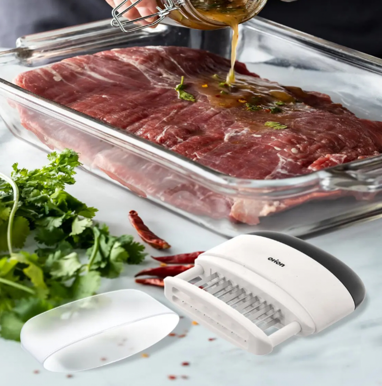 Stačí položiť tenderizér na plátok surového mäsa, zatlačiť na rukoväť a postup opakovať po celej ploche steaku. Ostré nerezové čepele preniknú do mäsa a zjemnia jeho vlákna. Ak mäso marinujete, tenderizér umožní, aby marináda prenikla hlbšie, čím sa marinovanie stáva rýchlejším a účinnejším. Aj doma tak dosiahnete profesionálne výsledky.