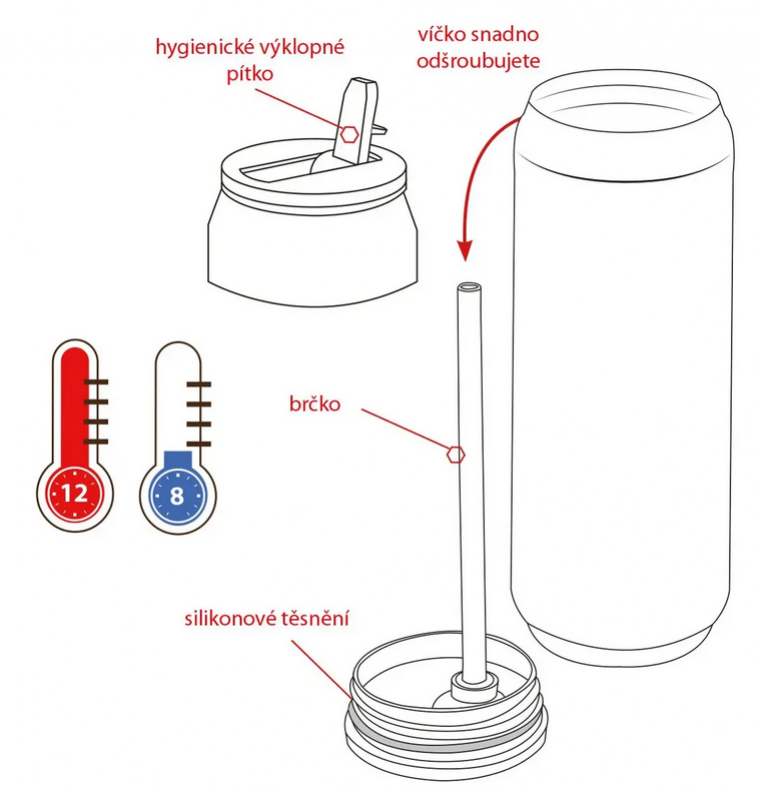 - Uzáver: Otočné viečko so šróbovacím závitom a silikónovým tesnením zabraňuje neželanému rozliatiu nápoja.
