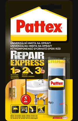 'PATTEX REPAIR EXPRESS UNIVERZÁLNY HMOTA NA OPRAVY 5 MIN 48 Glepidlo, lepidlo Pattex, lepidlo repair, lepidlo na, Henkel lepidlo, lepidlá, dlažbu lepidlo na, lepidlo na plasty, kov lepidlo na, drevo lepidlo, na, lepidlo na pvc, lepidlo kov, lepidlo plasty Popis:Univerzálna hmota na opravy a lepenie.Použitie:Na lepenie a opravy všetkých typov materiálov: drevo, kovy, keramika, plasty (okrem PE, PP a teflónu), sklo, tehly, dlaždice, sadra, korok, zrkadlá atďPríklady: lepenie kúpeľňového a kuchynského príslušenstva ako sú držiaky na uteráky, zrkadlá, úchytky, vešiaky, misky na mydlo, držiaky na mixéry
