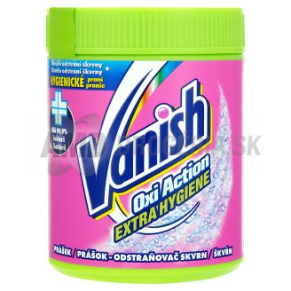 Vanish Oxi Action Extra Hygiene odstraňovač škvŕn 470 g Vanish Oxi Action Extra Hygiene v sebe kombinuje silu Oxi Action, ktorá vyhľadá a odstráni všetky typy škvŕn. Špecifické hygienické zložky, ktoré ničia 99,9% baktérií. Pridávajte 1 odmerku Vanish Oxi Action Extra Hygiene do každého prania. Je bezpečný na farebné i biele prádlo. Pri praní: Pre odolné a zaschnuté škvrny 1 odmerku. Pre bežné škvrny 1/2 odmerky. Namáčanie: Rozpustite 1 odmerku v 4 litroch teplej vody. Biele prádlo max 6 hodín. Farebné max 1 hodinu. Antibakteriálny účinok: Pridajte 1 odmerku do 4 litrov teplej vody (40 ° C) a namočte bielizeň po dobu 1 hodiny. Odporúčania k použitiu prípravku: Vždy sa riaďte pokynmi pre pranie, ktoré sú uvedené na štítku a pokyny pre starostlivosť o daný odev či látku. Pred použitím skontrolujte stálosť farieb prevedením testu na nejakom menej viditeľnom mieste. Vypláchajte a nechajte vysušiť. Nepoužívajte na vlnené alebo hodvábne deky a prikrývky. Oblečenie vyprané alebo ošetrené Vanish nevystavujte priamemu slnečnému svetlu a nesušte priamo u žiadneho tepelného zdroja. V prípade použitia pri predpierke, použite teplú vodu. Pre odolné škvrny sa môže požadovať opakovanie procesu. Nenanášajte produkt na kovové súčasti odevov (napr. gombíky, zipsy), nepoužívajte spoločne s bielidlom. Nenechávajte Vanish na bielizni zaschnúť (max. čas kontaktu výrobku s bielizňou je 10 minút). Upozornenie: Škodlivý pri požití. Riziko vážneho poškodenia očí. Uchovávajte uzamknutý a mimo dosahu detí. Uchovávajte na chladnom mieste. Uchovávajte nádobu suchú. Pri styku s pokožkou okamžite umyte veľkým množstvom vody. Zabráňte kontaktu s pokožkou a očami. Pri zasiahnutí očí okamžite dôkladne vypláchnite vodou a vyhľadajte lekársku pomoc. Používajte osobné ochranné prostriedky na oči a tvár. Pri požití okamžite vyhľadajte lekársku pomoc a ukážte tento obal alebo označenie. Pre citlivú pokožku sa odporúča použitie rukavíc.