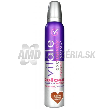 Vitale Tones farbiace penové tužidlo Chestnut 200 mlFarbiace pena dodá Vašim vlasom prirodzenú farbu, ktorá vydrží až 5 umytí. - vďaka špeciálnej receptúre je ideálny pre zvýraznenie prirodzenej farby aj melíru alebo krytie bielych vlasov a šedín. - prídavok kondicionéru podporuje rovnomerné nanesenie farby a lesk, zatiaľ čo modelujúci prvky dodávajú vlasom ľahké a pružné spevnenie. - obsahuje vitamín E, ktorý zvýrazní farbu, vyživuje a chráni pred UV žiarením. - k dokonalej úprave použite lak na vlasy Vitale. Návod na použitie: Umyte vlasy a osušte uterákom. Pred použitím nádobkou dobre zatrepte. Nasaďte si ochranné rukavice. Držte nádobku zvisle dolu a nastriekajte si do dlane penu vo veľkosti vajca. Rovnomerne naneste smerom spredu dozadu, votrite do vlasov prstami (vyhnite sa kontaktu s pokožkou hlavy). Nevyplachujte. Prečešte a upravte. Nehodí sa pre riasy a obočie.