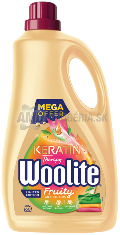 Woolite tekutý prací gél Keratin Therapy Fruity je určený pre farebnú bielizeň. Jeho zloženie s keratínom a ovocnou vôňou chráni oblečenie pred stratou tvaru, farby a žmolkovaním.